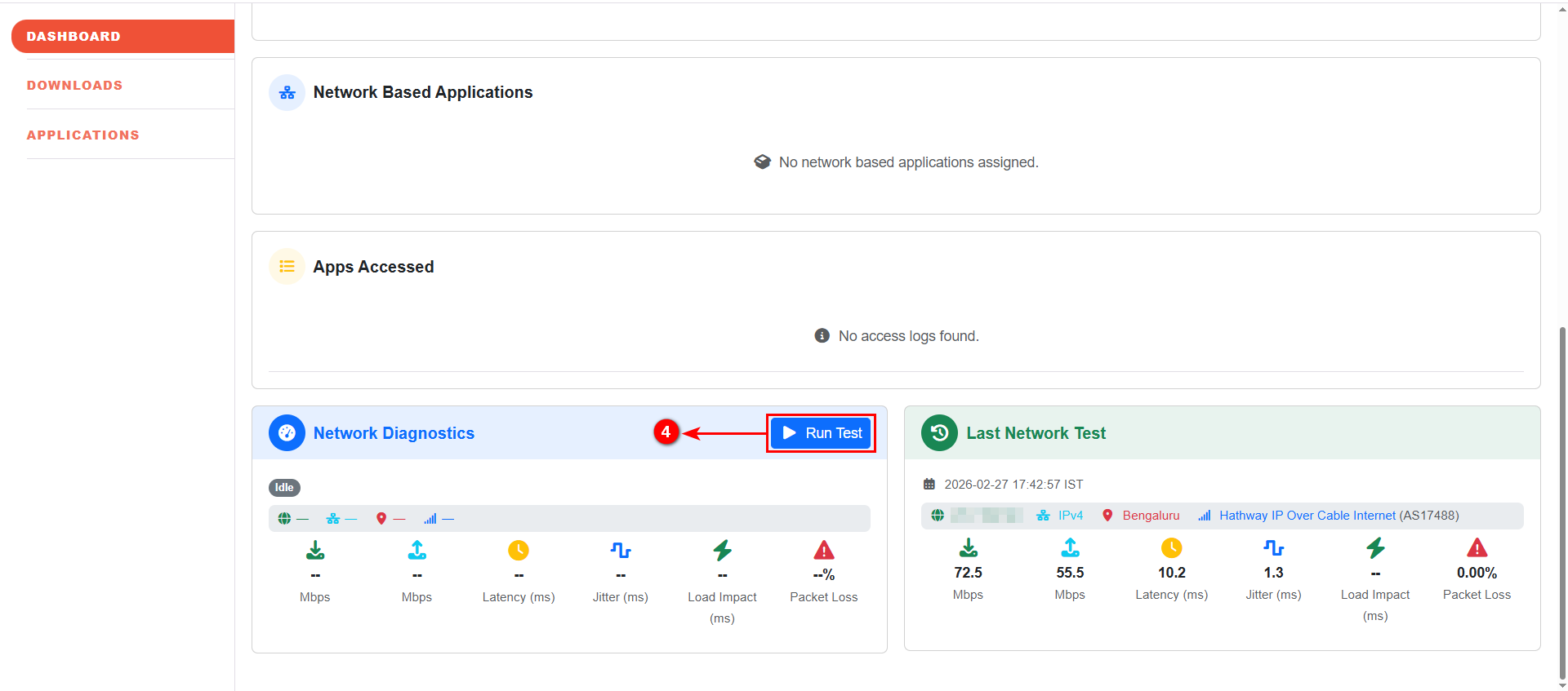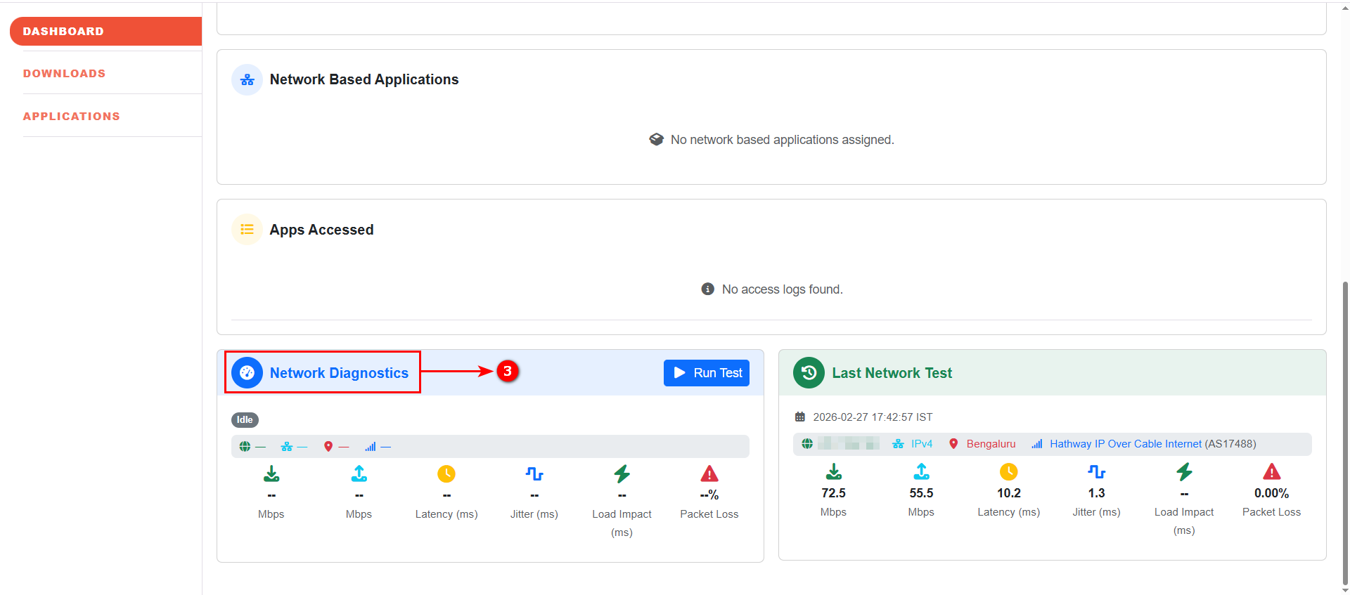 Network Diagnostics is a built-in troubleshooting feature available within the InstaSafe User Portal (Console). It enables users to run real-time network performance tests directly from the dashboard to identify connectivity or performance issues affecting secure application access.