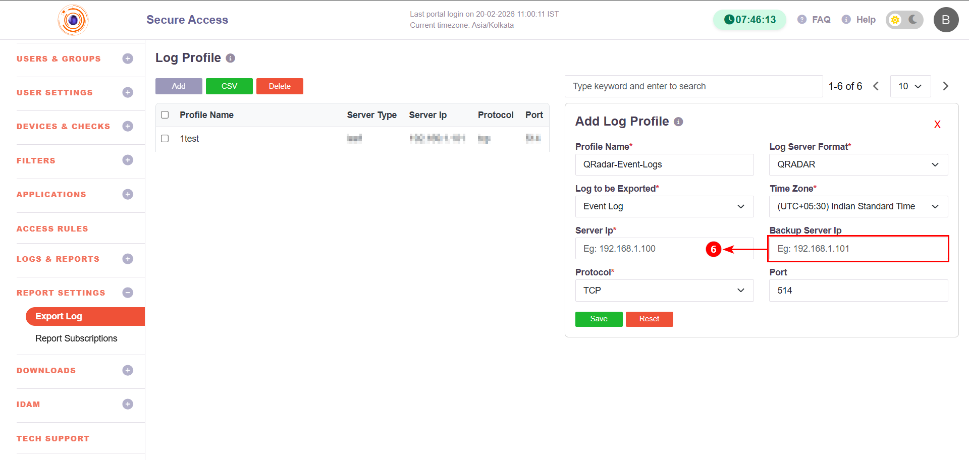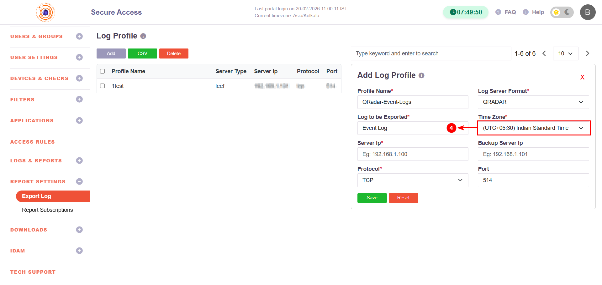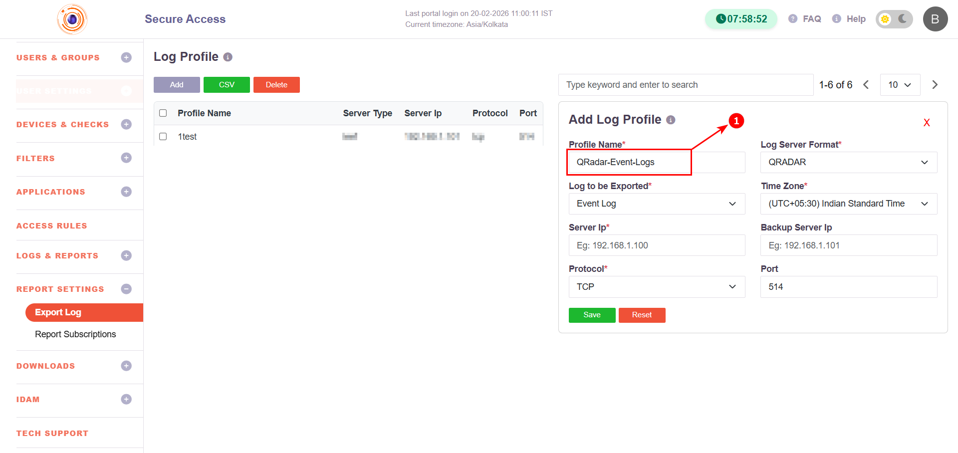 The Log Export feature enables centralized log monitoring by forwarding InstaSafe logs to external SIEM platforms or secure transfer destinations. By configuring a Log Profile, administrators can select the log type, format, protocol, and destination details to meet monitoring and compliance requirements.